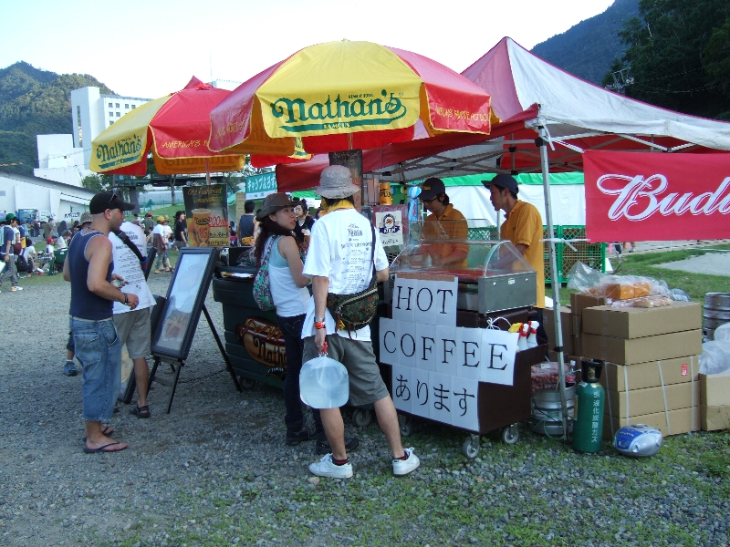 臨時設置された自動販売機。ハーゲン・ダッツはおそらく会場周辺で唯一でしょう。赤いTシャツを着ている人は、フジロックフェスティバル限定のライターがついてくることを宣伝しているたばこメーカーの担当者。