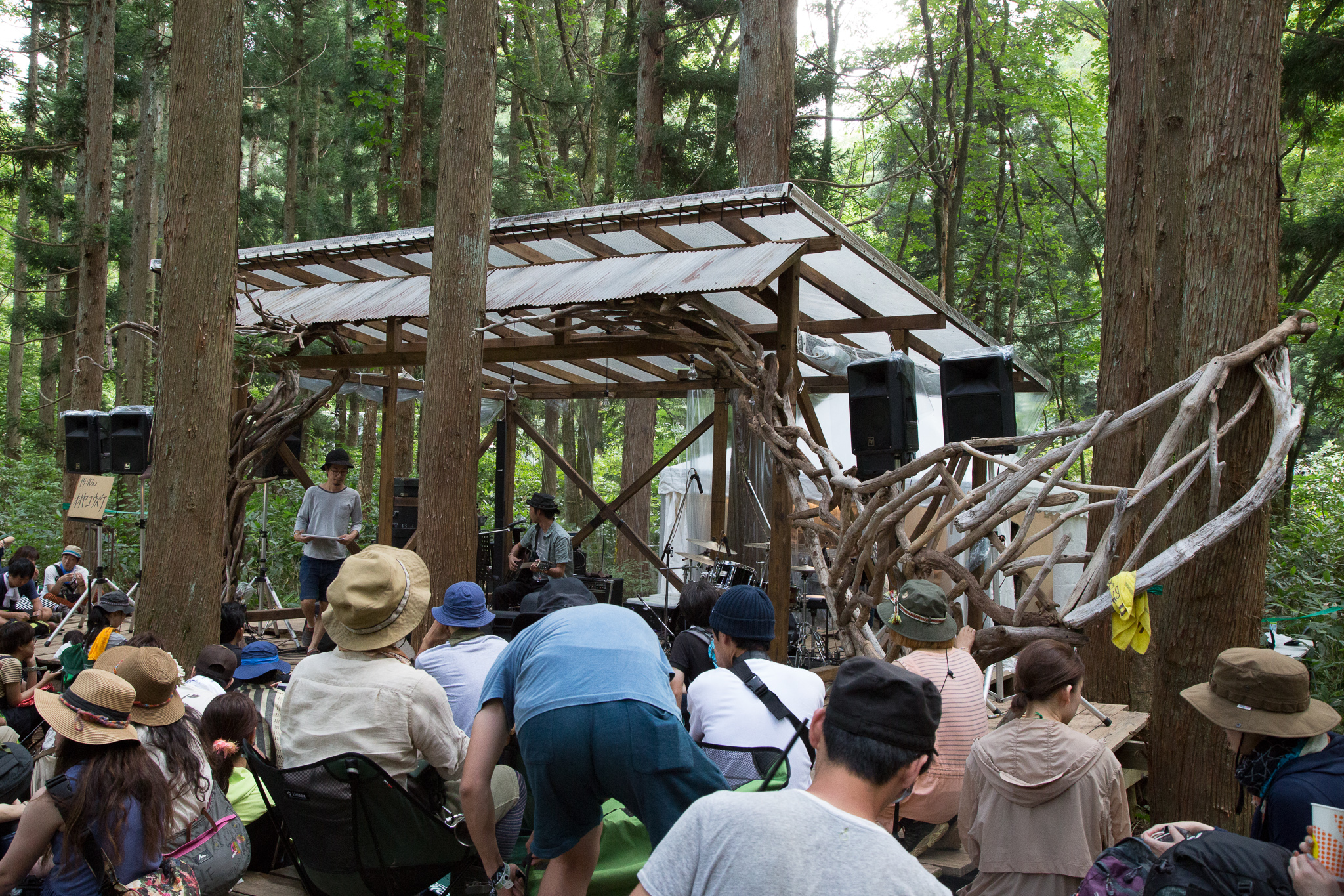 木道亭のステージ。ボードウォークを降りていすに座っている人がほとんどです。