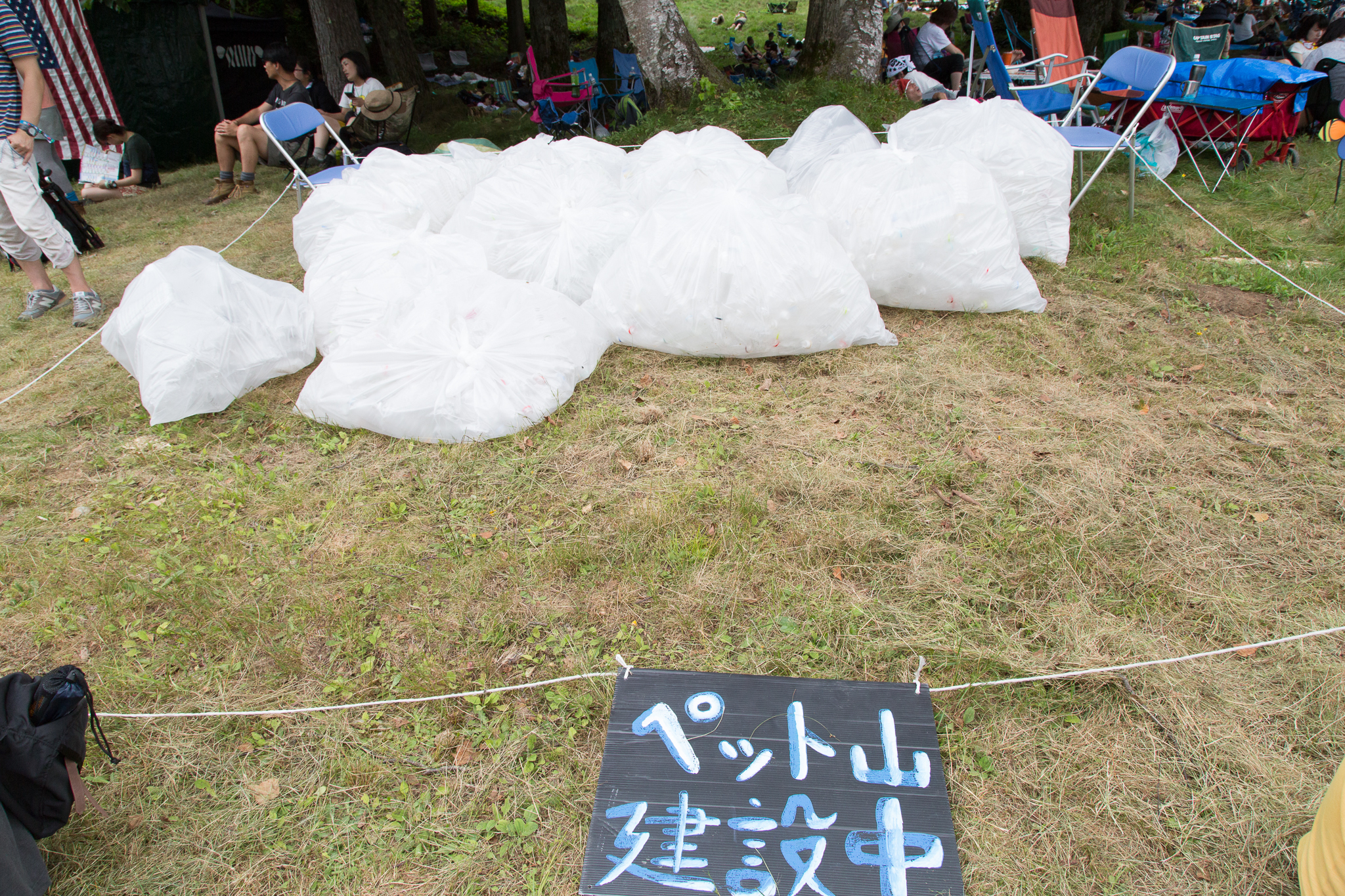 グリーンステージの北側にあるテント群。エコアクション。向かいにペットボトルのごみ袋が積まれます。