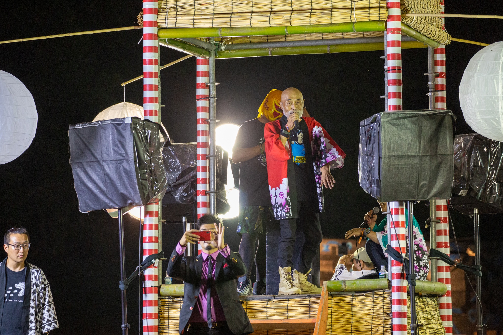 今年から櫓に立つ人が増えました。コメディアンのサク・ヤナガワ。